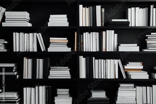 Fototapeta premium White books arranged on black wooden shelves creating minimalist monochrome...