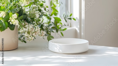 © Saff, Fototapeta premium White bowl on table, flowers near window, sunlight. Product display
