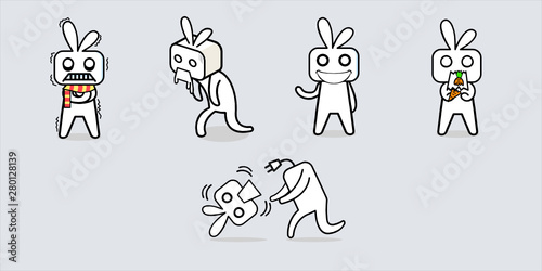 Fototapeta premium White box like rabbit robot cartoon character design. Action expression and emotion set cold, puke, smile, bite a carrot and fall out unplug head.