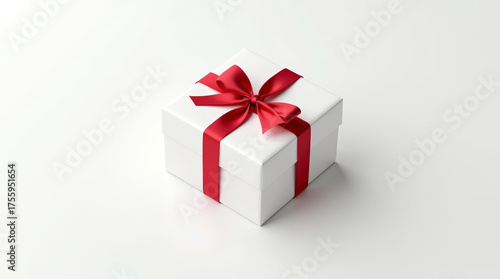 Fototapeta premium White box tied with red satin ribbon on a clean white background, simple...