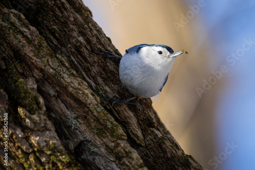 Fototapeta premium White-breasted nuthatch foraging for food during a cold winter morning.
