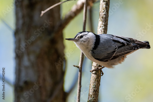 © George Schmiesing, Fototapeta premium White-breasted nuthatch holding on branch