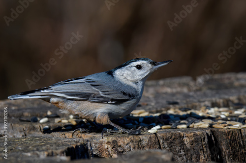 © Michael, Naklejka premium White-breasted nuthatch perching on an old tree stump. It is a small songbird of the nuthatch family common across much of temperate North America.