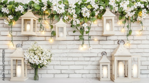 Naklejka premium White brick wall backdrop, floral garland, lanterns, lights, spring wedding decor