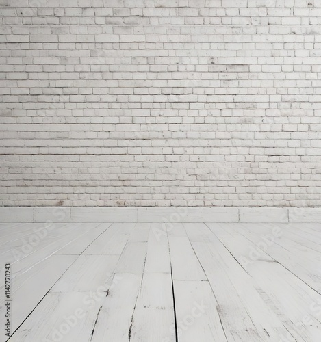 Fototapeta premium White brick wall with white wooden floor and natural textures, natural texture, earthy tones, white brick