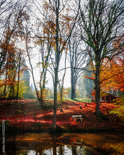 © Patrick, Fototapeta premium White Bridge near lake in fall close to Castle Spielfeld, Austria