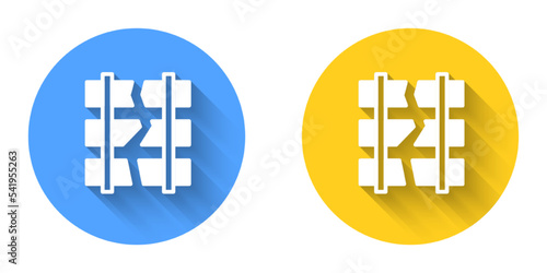 Fototapeta premium White Broken or cracked rails on a railway icon isolated with long shadow background. Circle button. Vector
