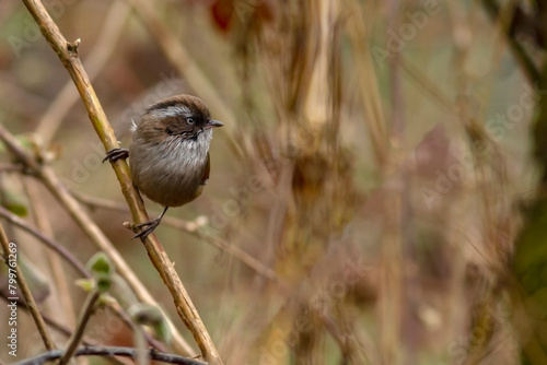 Naklejka premium White-browed fulvetta sitting on a thin branch looking for food.