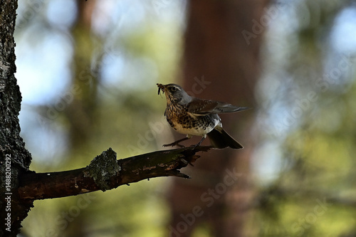© Mikhail, Fototapeta premium White-browed Thrush with prey on a tree branch.