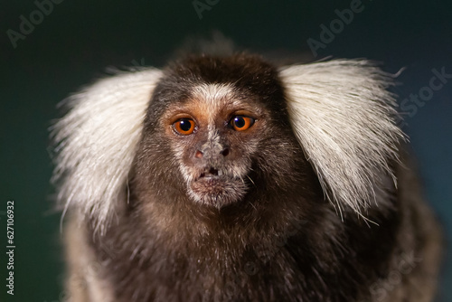 Naklejka premium White brush-eared marmoset looking at camera. Small monkey on a tree. Close-up of a Titi monkey.