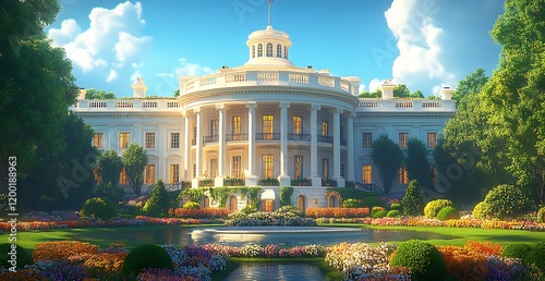 © MicroTech, Fototapeta premium White building with columns beside a pond