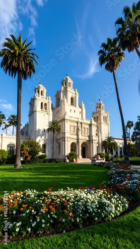 © Marko, Fototapeta premium White building with palm trees and flowers