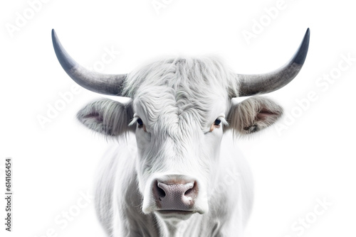 Naklejka premium White bull portrait. Adult silver white bull with large horns on white background. Generative Ai.
