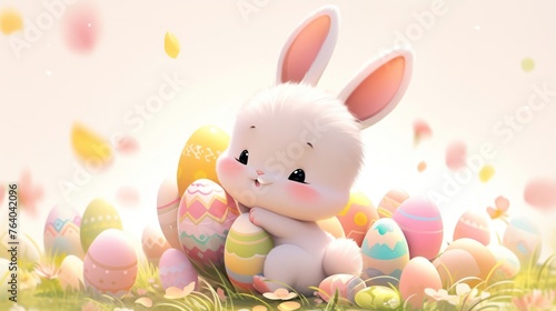 © Johnathan, Obraz premium White Bunny Sitting on Top of Pile of Eggs Generative AI
