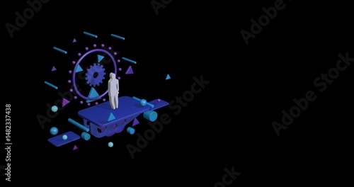 Fototapeta premium White burkini symbol on a pedestal of abstract geometric shapes floating in the air. Abstract concept art with flying shapes on the left. 3d illustration on black background