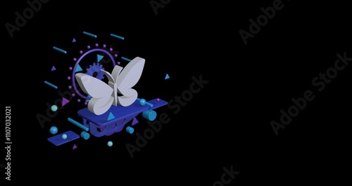 Obraz premium White butterfly symbol on a pedestal of abstract geometric shapes floating in the air. Abstract concept art with flying shapes on the left. 3d illustration on black background
