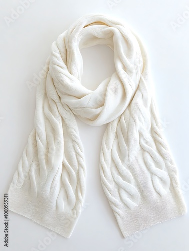 © NatthaphonSiri, Obraz premium White Cable Knit Scarf on a White Background.