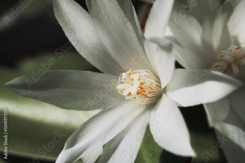 © colnihko, Obraz premium White cactus flowers macro, sunny day. Blossom floral background, selective focus