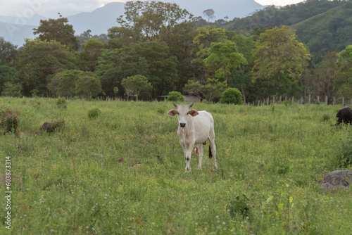 Obraz premium White calf enjoying its fresh grass in the pasture