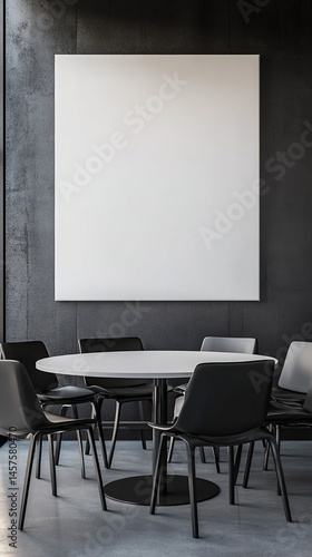 Fototapeta premium White Canvas, Round Table, and Black Chairs in Minimalist Interior