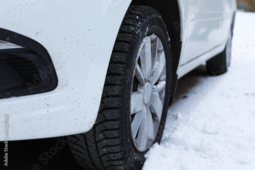 © 22_monkeyzzz, Naklejka premium white car in the snow, car wheel in the snow