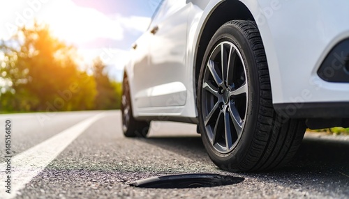 © Murai, Naklejka premium White car on a road with a dark object on the ground
