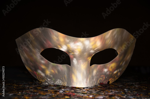 © polmanet, Naklejka premium White carnival mask with reflections of sequins on a black background