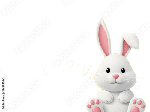 Obraz premium White cartoon bunny with pink ears and paws looking forward on transparent...