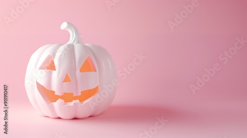 Fototapeta premium White carved pumpkin on pink background with free space, cute minimalistic Halloween banner