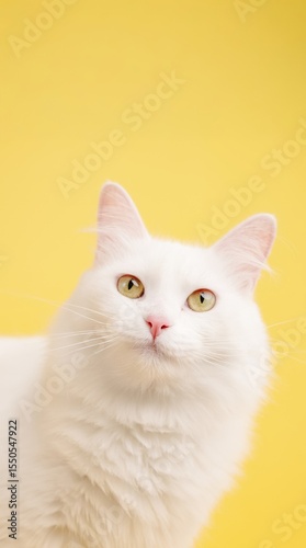 © DMegias, Fototapeta premium White cat posing on yellow background: fluffy feline with expressive eyes