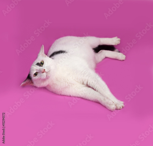 © Hanna Darzy, Fototapeta premium White cat with black spots lying on pink