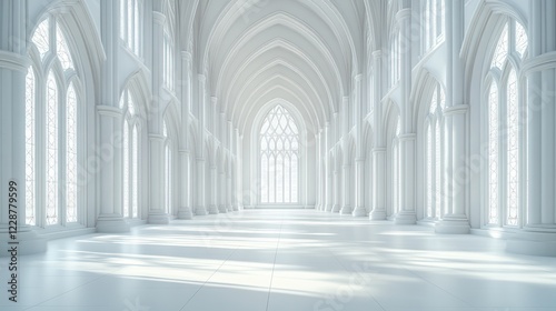 Naklejka premium White Cathedral Hallway, Sunlight, Gothic Architecture, Empty, Interior Design