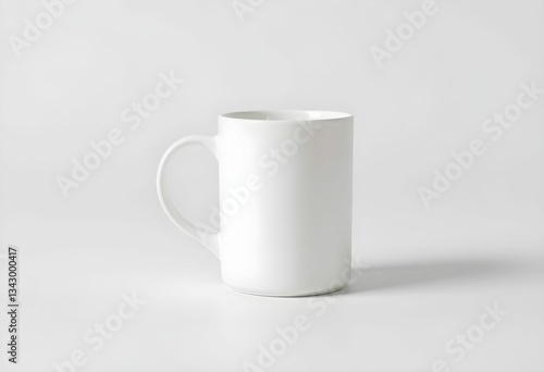 Fototapeta premium White ceramic mug, minimalist design, clean background, simple composition, product photography, soft lighting, matte finish, cylindrical shape, handle visible, neutral tones, studio shot