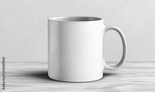 © bandul, Fototapeta premium White Ceramic Mug on Wooden Table Against White Wall