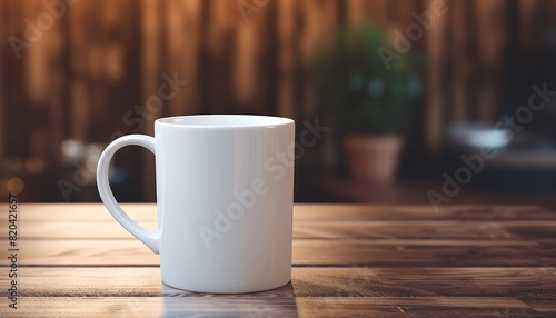 Fototapeta premium White ceramic mug on wooden table in the morning light.