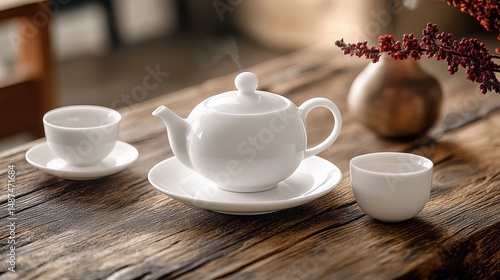 Obraz premium White Ceramic Tea Set on Rustic Wooden Table