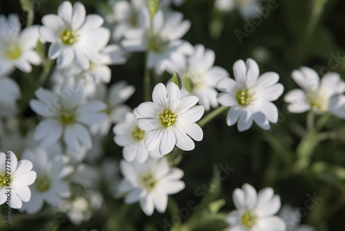 Obraz premium White cerastium blossoms with dark green and bokeh background