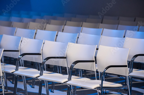 Fototapeta premium White chairs in a conference hall perfectly aligned