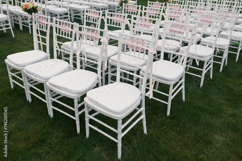 Naklejka premium White chairs stand in the row on green lawn