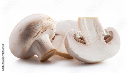Fototapeta premium White champignon mushrooms on white background, culinary cooking ingredient....