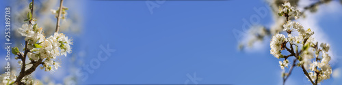 Fototapeta premium White cherry blossom left and right side in spring against a blue sky