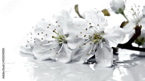 © Riocool, Fototapeta premium White cherry blossoms with dewdrops on petals reflecting on water
