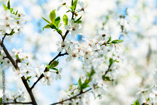 Fototapeta premium White cherry flowers on cherry branch with blue sky