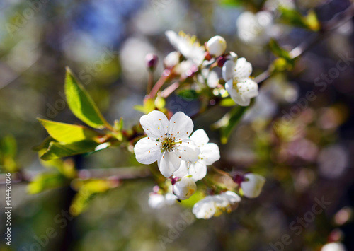Obraz premium White cherry tree blossoms and blurred background in spring
