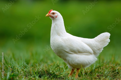Fototapeta premium White chicken stands in a grassy field with a blurred green background Its beak is yellow and its comb is red