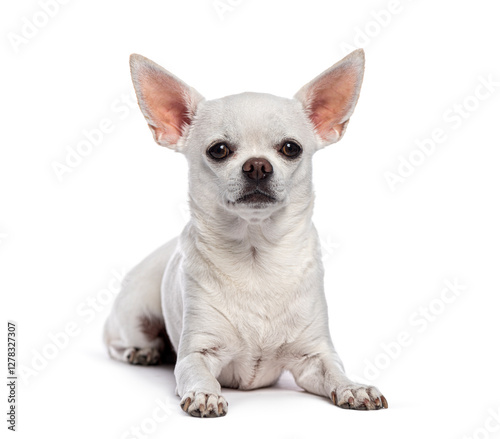 © Eric Isselée, Obraz premium White chihuahua lying down on white background