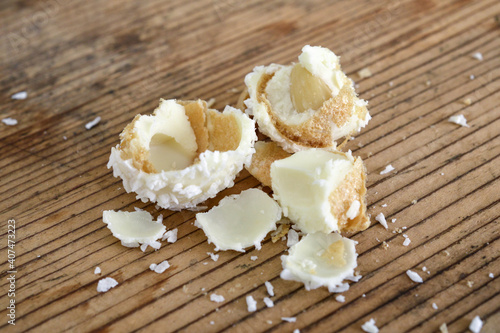 © bellakadife, Naklejka premium White Chocolate and Coconut Truffles on old wood background
