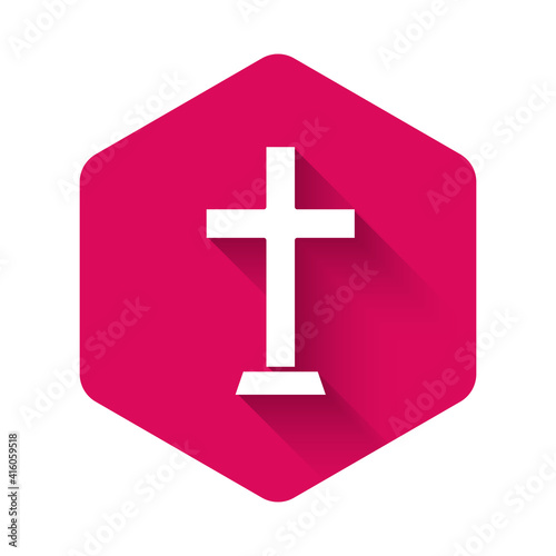© vector_v, Fototapeta premium White Christian cross icon isolated with long shadow background. Church cross. Pink hexagon button. Vector.