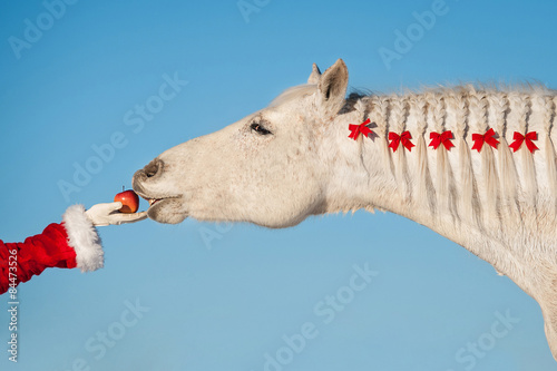 Fototapeta premium White christmas horse taking an apple from santa's hand