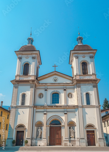 Obraz premium White church exterior with a blue sky in the background. The building has two towers